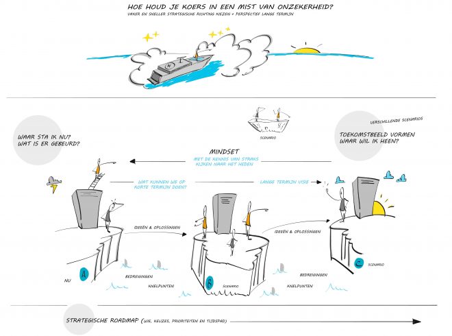 Samen maken we de toekomst voorstelbaar en complexe zaken helder, we creëren een concreet en gedeeld beeld (big picture). Dat geeft overzicht en creëert rust. Zo zet je makkelijker concrete stappen en neem je betere beslissingen.